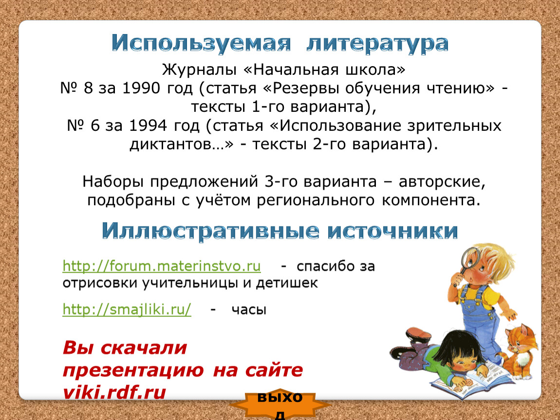 Журналы «Начальная школа»№ 8 за 1990 год (статья «Резервы обучения чтению» - тексты 1-го варианта),№ 6 за 1994 год (статья «Использование зрительных диктантов…» - тексты 2-го варианта).Наборы предложений 3-го варианта – авторские, подобраны с учётом регионального компонента.