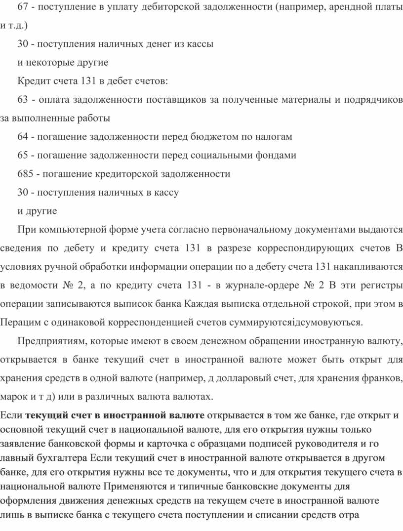 При компьютерной форме учета согласно первоначальному документами выдаются сведения по дебету и кредиту счета 131 в разрезе корреспондирующих счетов В условиях ручной обработки информации операции по а дебету счета 131 накапливаются в ведомости № 2, а по кредиту счета 131 - в журнале-ордере № 2 В эти регистры операции записываются выписок банка Каждая выписка отдельной строкой, при этом в Перацим с одинаковой корреспонденцией счетов суммируютсяідсумовуються.