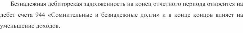 Безнадежная дебиторская задолженность на конец отчетного периода относится на дебет счета 944 «Сомнительные и безнадежные долги» и в конце концов влияет на уменьшение доходов.