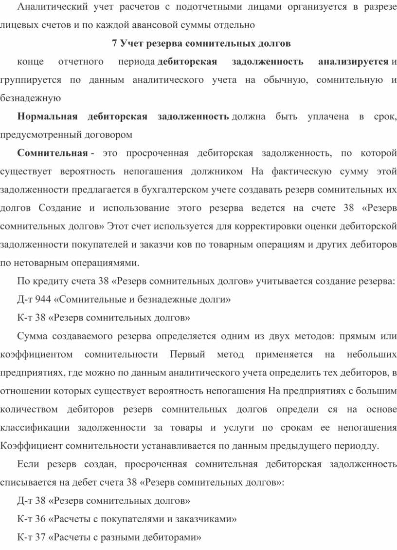 Сомнительная - это просроченная дебиторская задолженность, по которой существует вероятность непогашения должником На фактическую сумму этой задолженности предлагается в бухгалтерском учете создавать резерв сомнительных их долгов Создание и использование этого резерва ведется на счете 38 «Резерв сомнительных долгов» Этот счет используется для корректировки оценки дебиторской задолженности покупателей и заказчи ков по товарным операциям и других дебиторов по нетоварным операциямями.