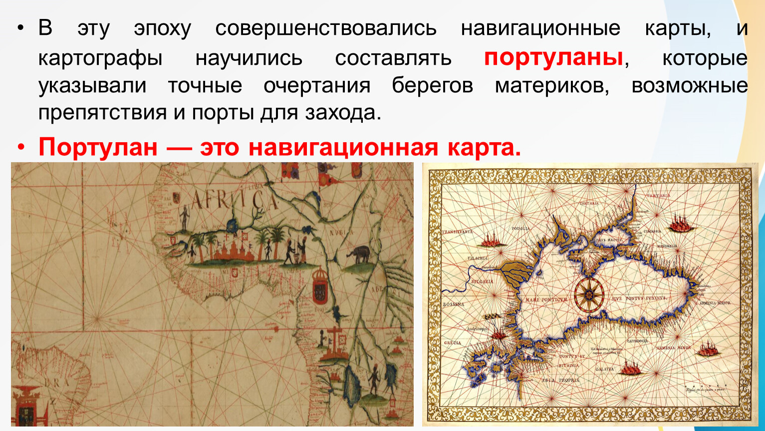 В эту эпоху совершенствовались навигационные карты, и картографы научились составлять портуланы, которые указывали точные очертания берегов материков, возможные препятствия и порты для захода.