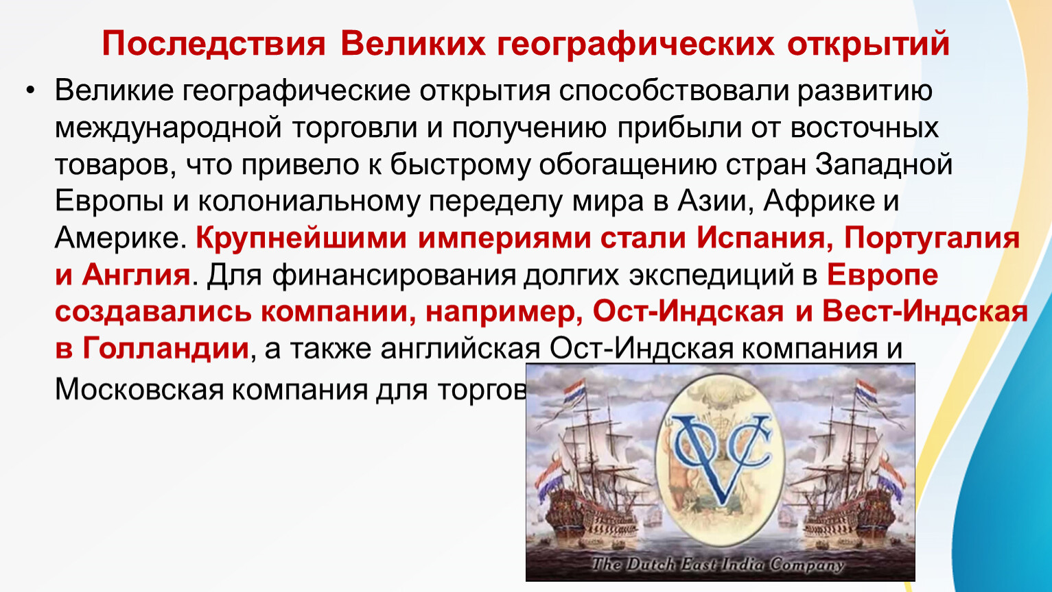 Великие географические открытия способствовали развитию международной торговли и получению прибыли от восточных товаров, что привело к быстрому обогащению стран Западной Европы и колониальному переделу мира в Азии, Африке и Америке. Крупнейшими империями стали Испания, Португалия и Англия. Для финансирования долгих экспедиций в Европе создавались компании, например, Ост-Индская и Вест-Индская в Голландии, а также английская Ост-Индская компания и Московская компания для торговли с Россией.