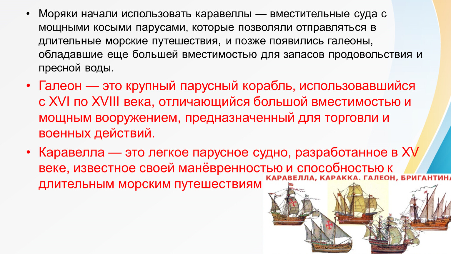 Моряки начали использовать каравеллы — вместительные суда с мощными косыми парусами, которые позволяли отправляться в длительные морские путешествия, и позже появились галеоны, обладавшие еще большей вместимостью для запасов продовольствия и пресной воды.
