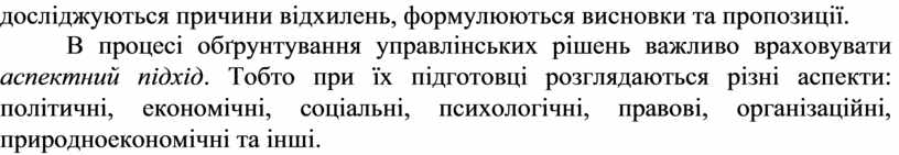 В процесі обґрунтування управлінських рішень важливо враховувати аспектний підхід. Тобто при їх підготовці розглядаються різні аспекти: політичні, економічні, соціальні, психологічні, правові, організаційні, природноекономічні та інші.