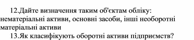 12.Дайте визначення таким об'єктам обліку: нематеріальні активи, основні засоби, інші необоротні матеріальні активи