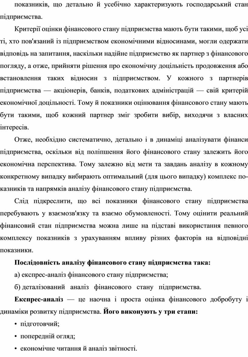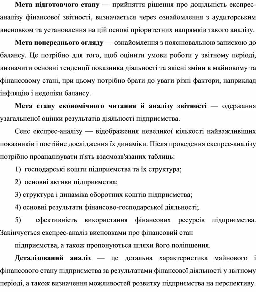 Фінансовий стан підприємства може бути оцінений з різним ступенем деталізації залежно від цілей аналізу, існуючої інформації, програмного, технічного та кадрового забезпечення. Найбільш доцільним с виділення процедур експрес-аналізу та поглибленого аналізу фінансового стану.