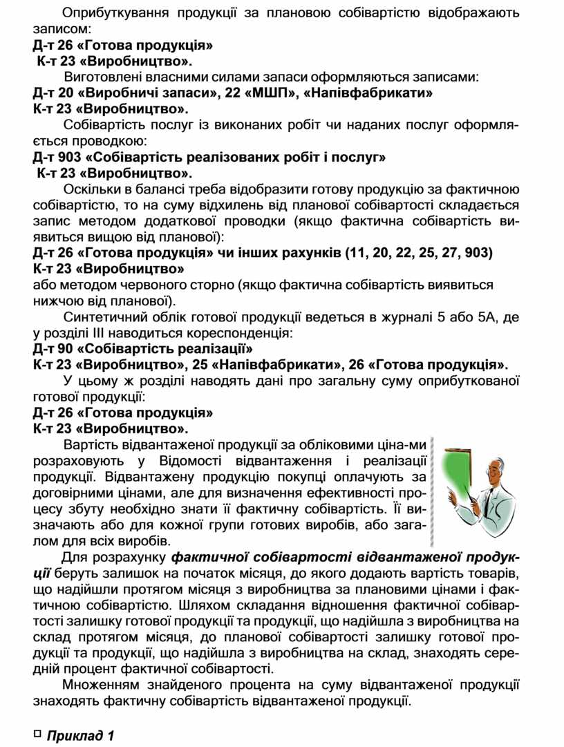 У балансі готову продукцію оцінюють за фактичною собівартістю, а в поточному обліку протягом місяця бухгалтер оприбутковує її за умовними цінами – плановими чи продажними. Отже, виникають розбіжності в оці- нюванні готової продукції. Щоб позбутися таких розбіжностей, треба ви- значити відхилення між фактичною та умовною вартістю продукції після складання калькуляцій і скласти виправні проводки.