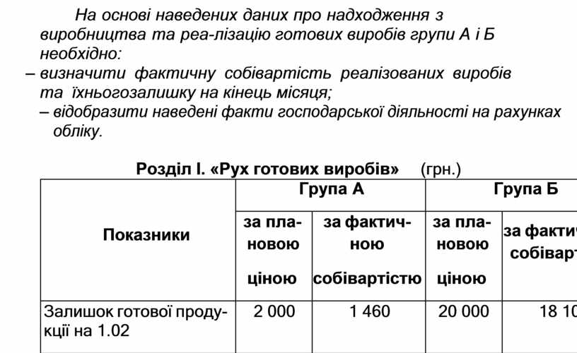 На основі наведених даних про надходження з виробництва та реа- лізацію готових виробів групи А і Б необхідно: