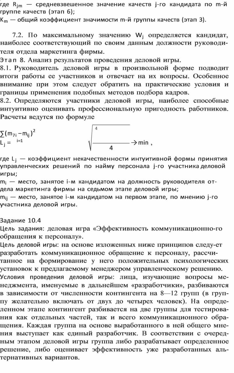 Условия проведения деловой игры: лица, изучающие в курсе ме-неджмента вопросы оценки профессиональной пригодности персо-нала, условно действуют как группа экспертов, осуществляющих анализ профессиональной пригодности кандидатур. Решения выно-сятся ими в коллегиальной форме абсолютным большинством голо-сов. В необходимых случаях проводится повторное голосование по двум предложениям, поддержанным наибольшим числом экспертов. Функции руководителя деловой игры: руководитель деловой игры обязан объяснить всем участникам порядок и правила действий. После этого он принимает участие в игре как один из экспертов, обладающих правом вето, если принимается заведомо неправильное решение. Вынесение вето должно быть обязательно аргументиро-