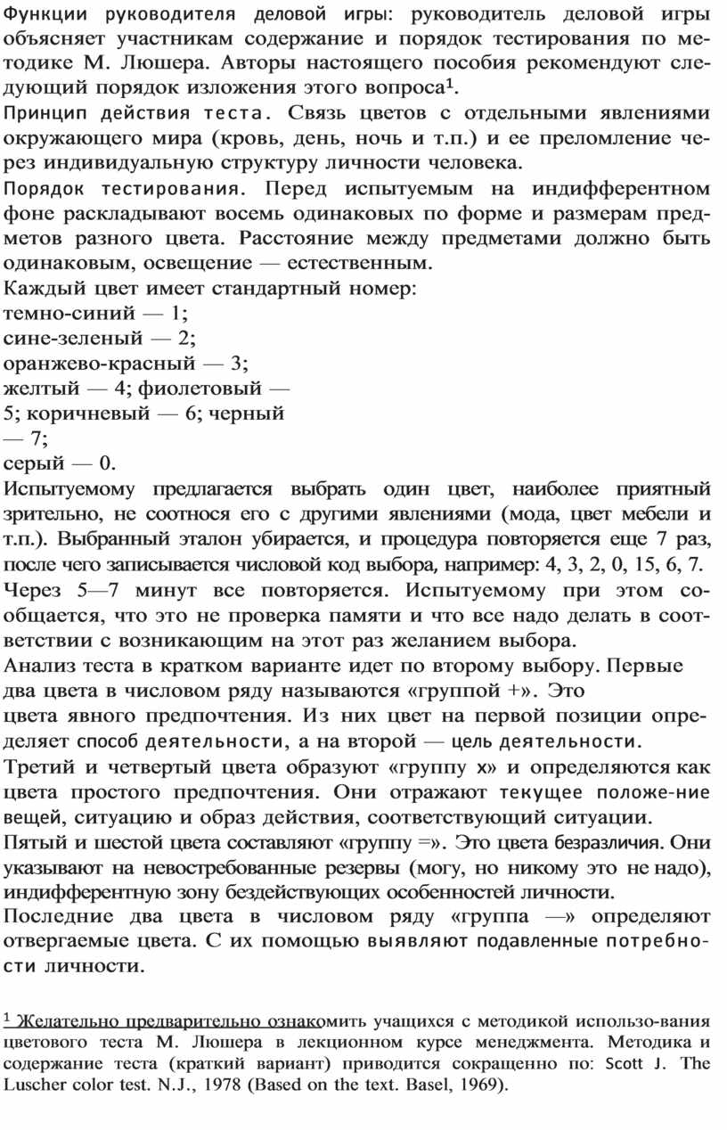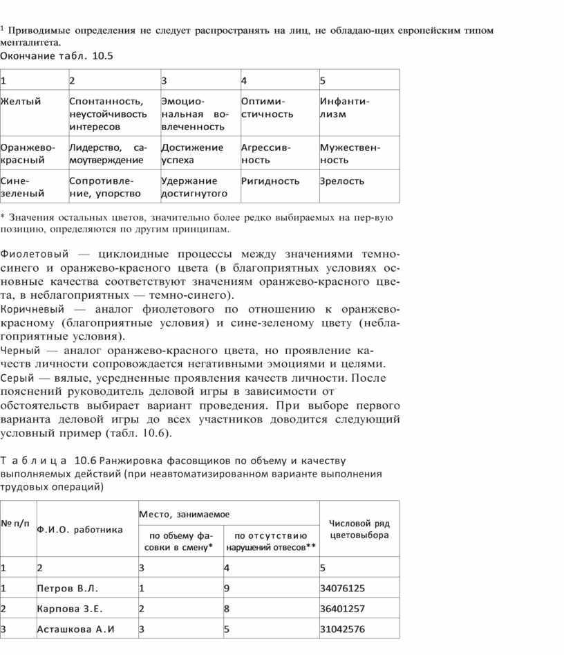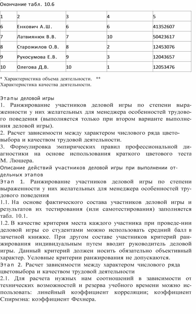 Этапы деловой игры 1. Ранжирование участников деловой игры по степени выра-женности у них желательных для менеджера особенностей трудово-го поведения (выполняется только при втором варианте выполне-ния деловой игры). 2. Расчет зависимости между характером числового ряда цвето-выбора и качеством трудовой деятельности. 3. Формулировка эмпирических правил профессиональной ди-агностики на основе использования краткого цветового теста М. Люшера. Описание действий участников деловой игры при выполнении от-дельных этапов Этап 1. Ранжирование участников деловой игры по степени выраженности у них желательных для менеджера особенностей тру-дового поведения 1.1. На основе фактического состава участников деловой игры и результатов их тестирования (или самотестирования) заполняется табл. 10.1. 1.2. В качестве критерия места каждого участника при проведе-нии деловой игры со студентами можно использовать средний балл в зачетной книжке. При другом составе участников критерий ран-жирования индивидуальным путем вводит руководитель деловой игры. Данный критерий должен носить обязательно объективный характер. Условные критерии ранжирования не допускаются. Этап 2. Расчет зависимости между характером числового ряда цветовыбора и качеством трудовой деятельности 2.1. Для расчета нужных нам соотношений в зависимости от технических возможностей и резерва учебного времени можно ис-пользовать: линейный коэффициент корреляции; коэффициент Спирмэна: коэффициент Фехнера. |
