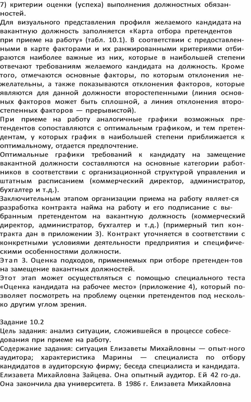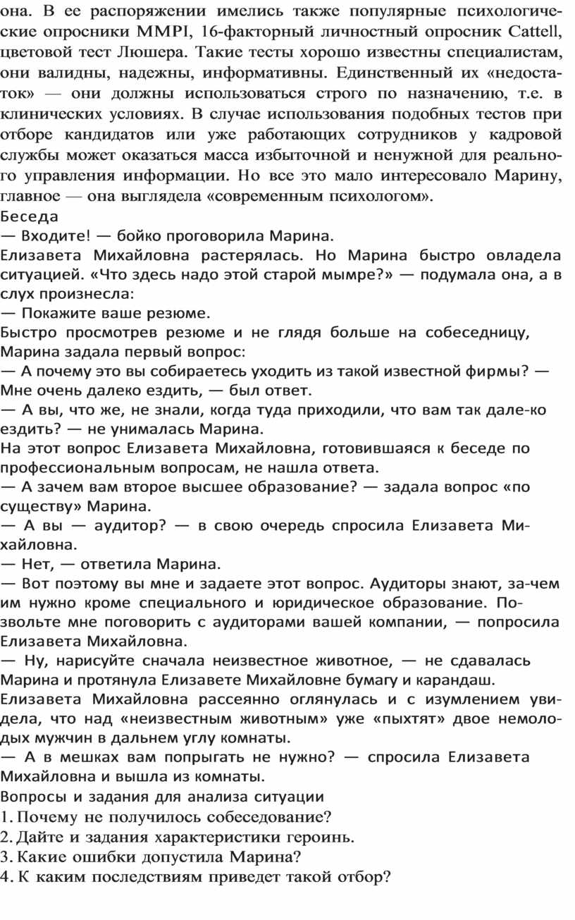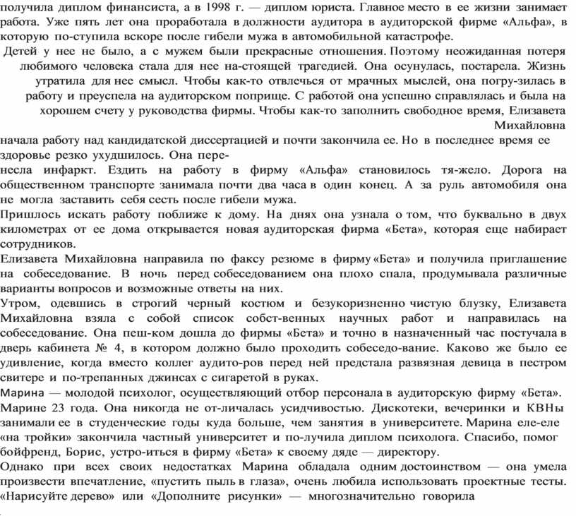Содержание задания: ситуация Елизаветы Михайловны — опыт-ного аудитора; характеристика Марины — специалиста по отбору кандидатов в аудиторскую фирму; беседа специалиста и кандидата.
