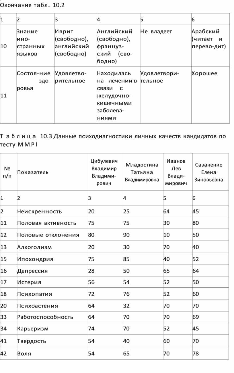 2) результаты психодиагностики их личных качеств на основе использования стандартного варианта Миннесотского много-фазного личностного опросника (MMPI) (табл. 10.3);