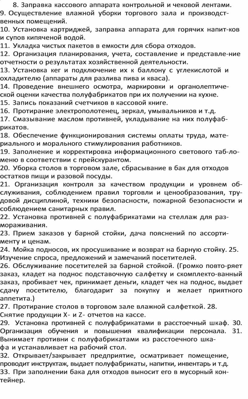 24. Мойка подносов, их просушивание и возврат на барную стойку. 25. Изучение спроса, предложений и замечаний посетителей.