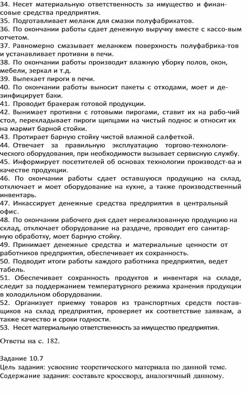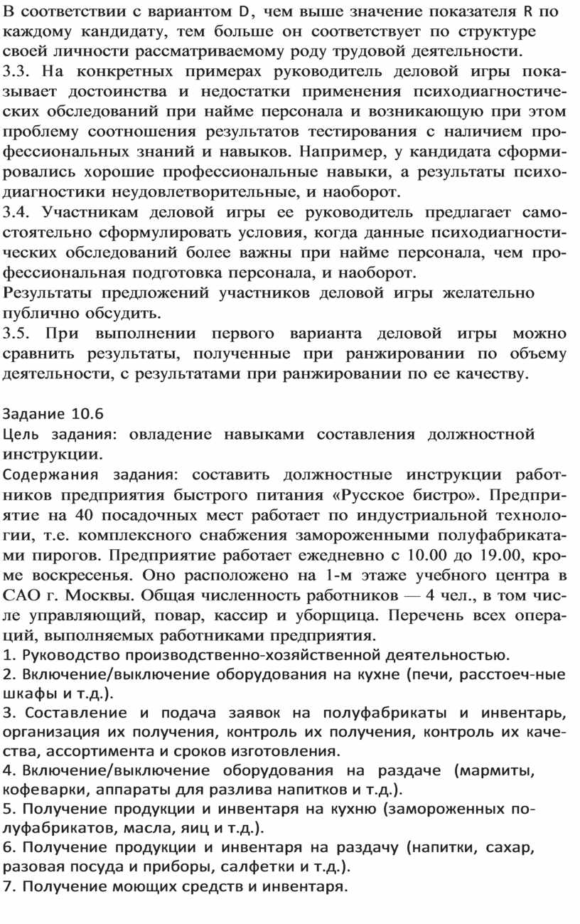 Содержания задания: составить должностные инструкции работ-ников предприятия быстрого питания «Русское бистро». Предпри-ятие на 40 посадочных мест работает по индустриальной техноло-гии, т.е. комплексного снабжения замороженными полуфабриката-ми пирогов. Предприятие работает ежедневно с 10.00 до 19.00, кро-ме воскресенья. Оно расположено на 1-м этаже учебного центра в САО г. Москвы. Общая численность работников — 4 чел., в том чис-ле управляющий, повар, кассир и уборщица. Перечень всех опера-ций, выполняемых работниками предприятия.