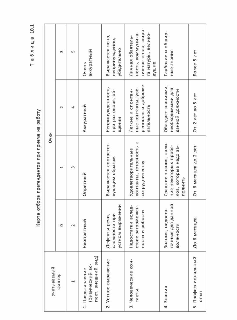 Для визуального представления профиля желаемого кандидата на вакантную должность заполняется «Карта отбора претендентов при приеме на работу» (табл. 10.1). В соответствии с предоставлен-ными в карте факторами и их ранжированными критериями отби-раются наиболее важные из них, которые в наибольшей степени отвечают требованиям желаемого кандидата на должность. Кроме того, отмечаются основные факторы, по которым отклонения не-желательны, а также показываются отклонения факторов, которые являются для данной должности второстепенными (линия основ-ных факторов может быть сплошной, а линия отклонения второ-степенных факторов — прерывистой).