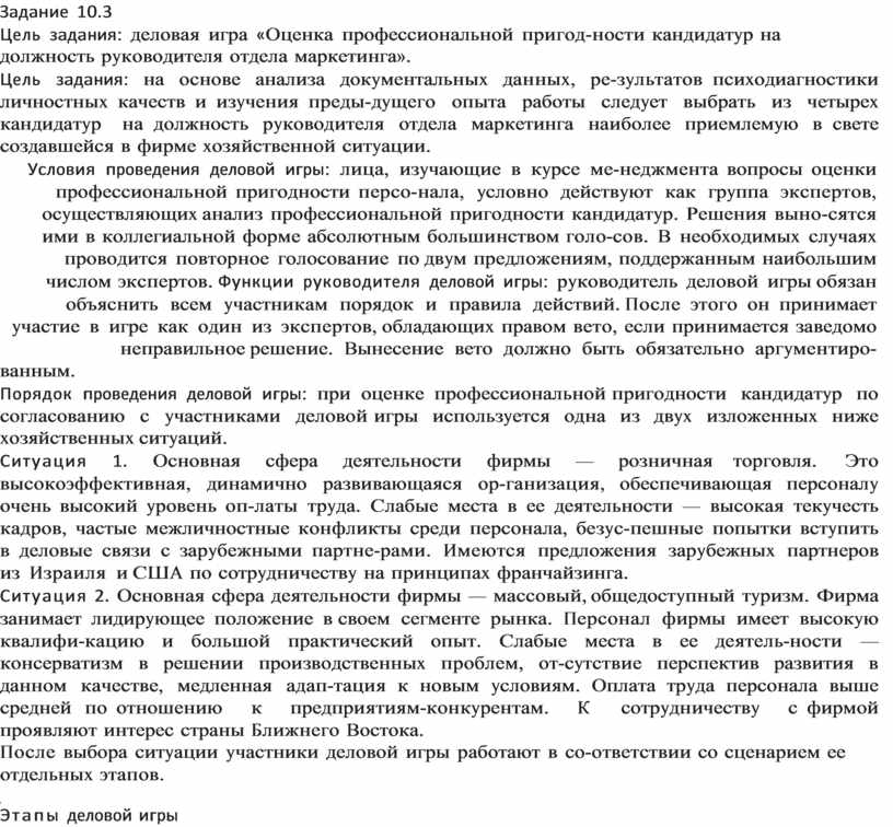 Порядок проведения деловой игры: при оценке профессиональной пригодности кандидатур по согласованию с участниками деловой игры используется одна из двух изложенных ниже хозяйственных ситуаций.
