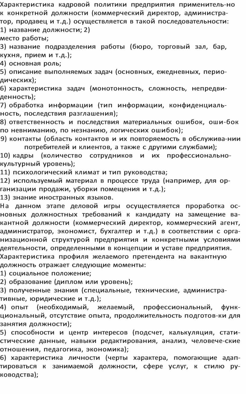 Характеристика кадровой политики предприятия применитель-но к конкретной должности (коммерческий директор, администра-тор, продавец и т.д.) осуществляется в такой последовательности: