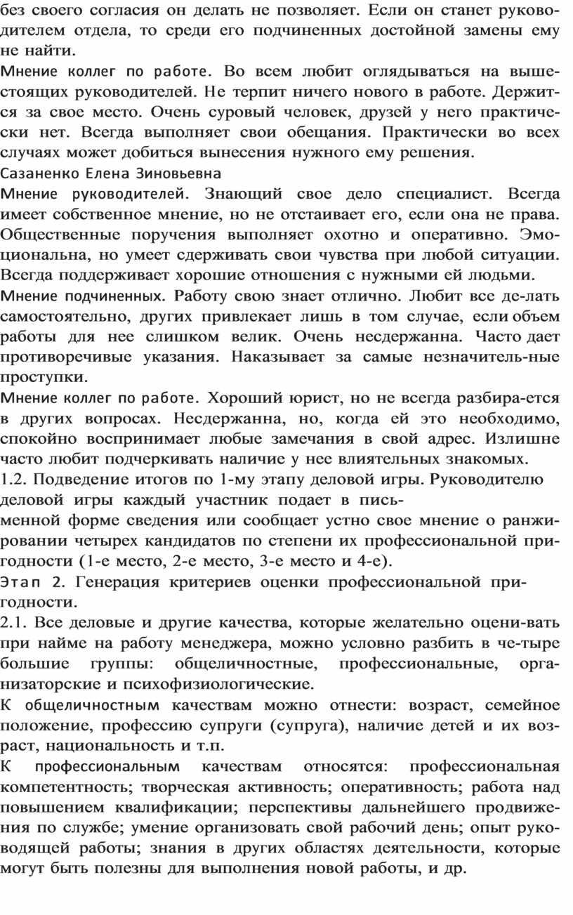 1. Неформальная оценка профессиональной пригодности кандида-тур. Каждый участник на основе 10—15-минутного ознакомления с характеристиками каждой кандидатуры в письменной или устной форме высказывает руководителю деловой игры свое мнение об их шансах занять вакантную должность в фирме.