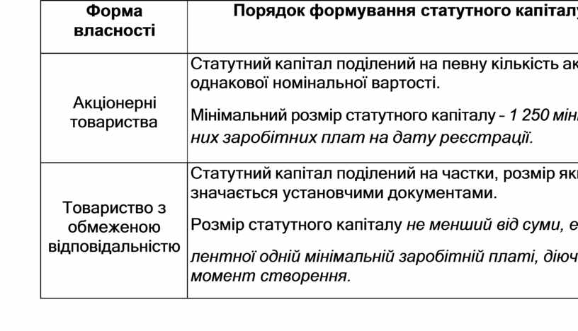 Статутний капітал поділений на певну кількість акцій однакової номінальної вартості. Мінімальний розмір статутного капіталу – 1 250 мінімаль- них заробітних плат на дату реєстрації. |