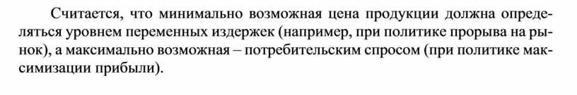 Считается, что минимально возможная цена продукции должна опреде- ляться уровнем переменных издержек (например, при политике прорыва на ры- нок), а максимально возможная – потребительским спросом (при политике мак- симизации прибыли).