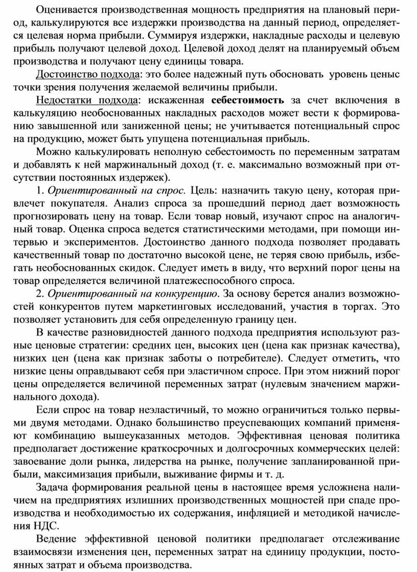 Недостатки подхода: искаженная себестоимость за счет включения в калькуляцию необоснованных накладных расходов может вести к формирова- нию завышенной или заниженной цены; не учитывается потенциальный спрос на продукцию, может быть упущена потенциальная прибыль.