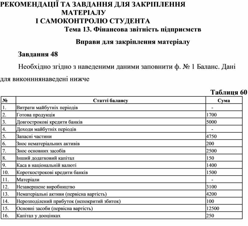 Необхідно згідно з наведеними даними заповнити ф. № 1 Баланс. Дані для виконннянаведені нижче