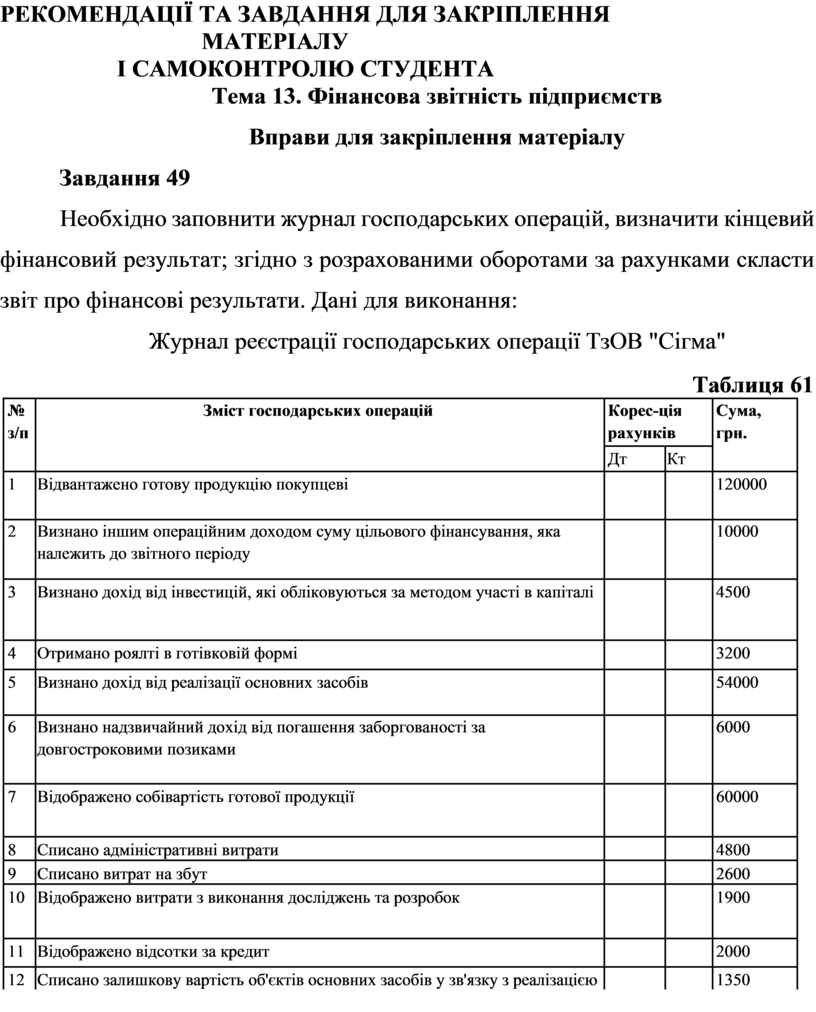 Необхідно заповнити журнал господарських операцій, визначити кінцевий фінансовий результат; згідно з розрахованими оборотами за рахунками скласти звіт про фінансові результати. Дані для виконання: