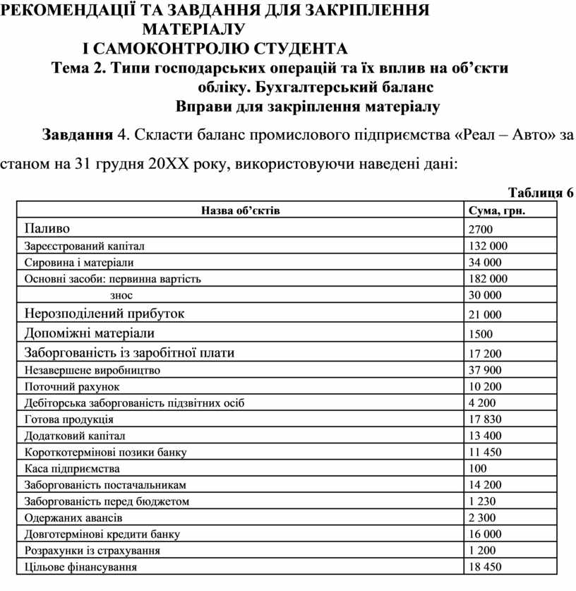Завдання 4. Скласти баланс промислового підприємства «Реал – Авто» за станом на 31 грудня 20ХХ року, використовуючи наведені дані: