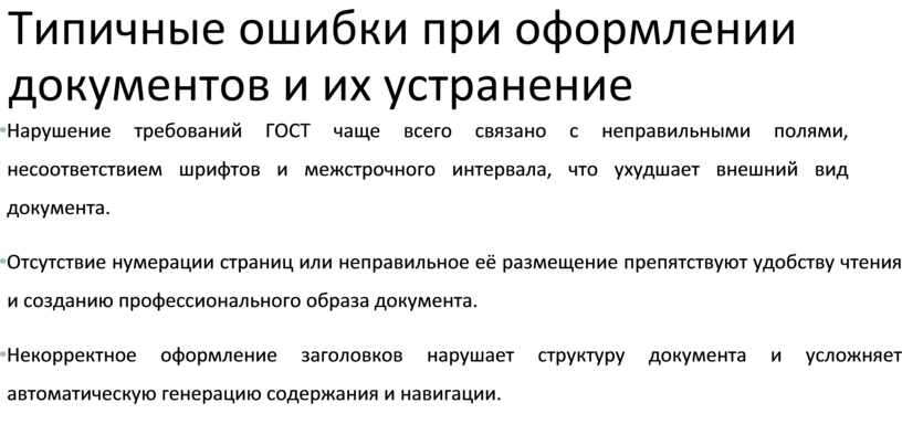 •Нарушение требований ГОСТ чаще всего связано с неправильными полями, несоответствием шрифтов и межстрочного интервала, что ухудшает внешний вид документа.