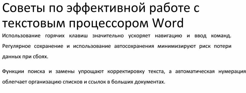Использование горячих клавиш значительно ускоряет навигацию и ввод команд. Регулярное сохранение и использование автосохранения минимизируют риск потери данных при сбоях.