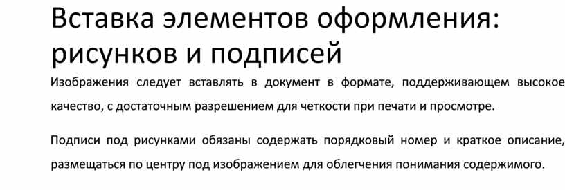 Изображения следует вставлять в документ в формате, поддерживающем высокое качество, с достаточным разрешением для четкости при печати и просмотре.