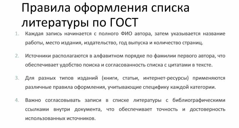 3. Для разных типов изданий (книги, статьи, интернет-ресурсы) применяются различные правила оформления, учитывающие специфику каждой категории.