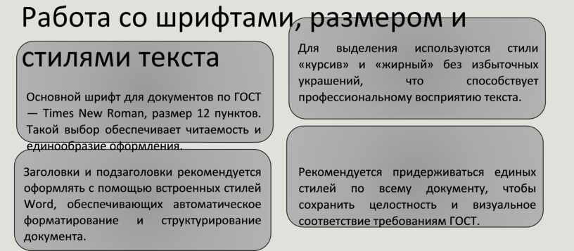 Рекомендуется придерживаться единых стилей по всему документу, чтобы сохранить целостность и визуальное соответствие требованиям ГОСТ.