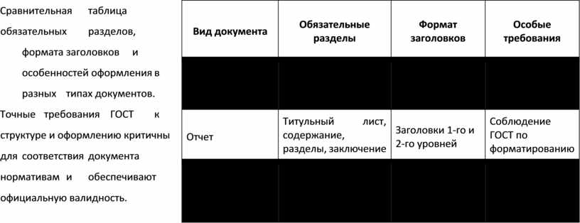 Сравнительная таблица обязательных разделов, формата заголовков и особенностей оформления в разных типах документов.