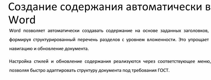 Word позволяет автоматически создавать содержание на основе заданных заголовков, формируя структурированный перечень разделов с уровнем вложенности. Это упрощает навигацию и обновление документа.