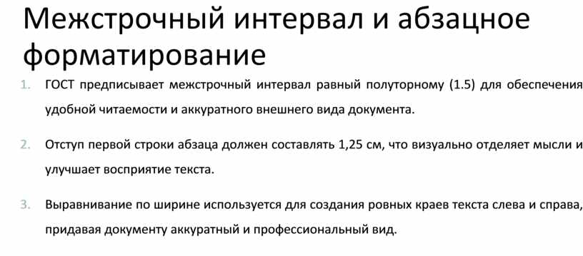 1. ГОСТ предписывает межстрочный интервал равный полуторному (1.5) для обеспечения удобной читаемости и аккуратного внешнего вида документа.