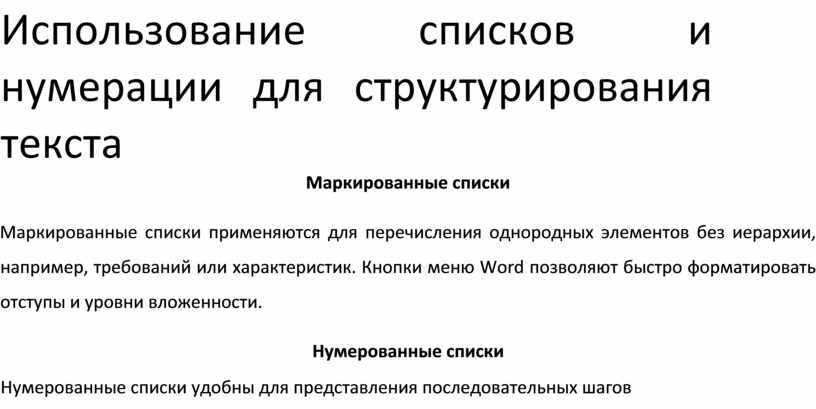 Нумерованные списки удобны для представления последовательных шагов или планов. Правильная настройка уровней и стилей нумерации обеспечивает логическую структуру и наглядность документа.