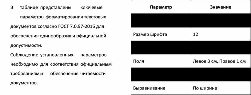 В таблице представлены ключевые параметры форматирования текстовых документов согласно ГОСТ 7.0.97-2016 для обеспечения единообразия и официальной допустимости.