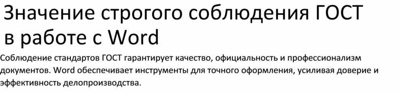 Соблюдение стандартов ГОСТ гарантирует качество, официальность и профессионализм документов. Word обеспечивает инструменты для точного оформления, усиливая доверие и эффективность делопроизводства.