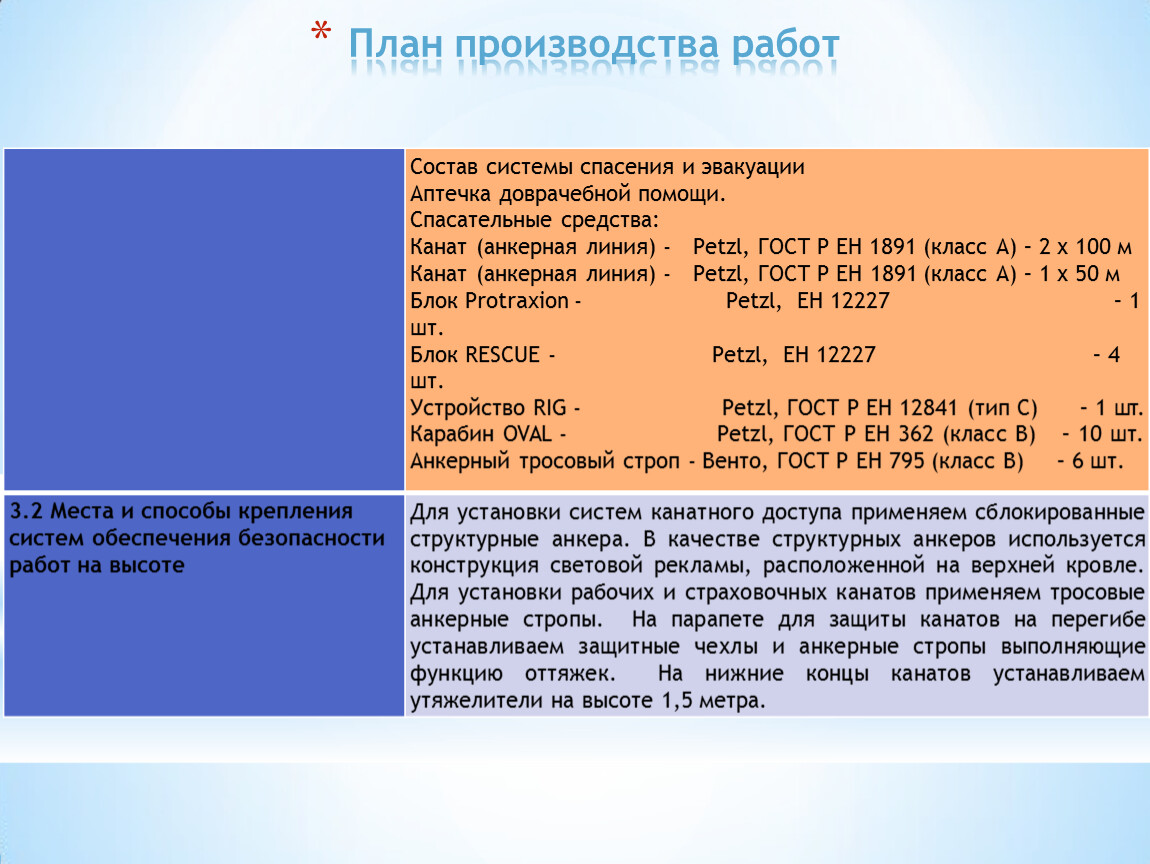 3.2 Места и способы крепления систем обеспечения безопасности работ на высоте | Для установки систем канатного доступа применяем сблокированные структурные анкера. В качестве структурных анкеров используется конструкция световой рекламы, расположенной на верхней кровле. Для установки рабочих и страховочных канатов применяем тросовые анкерные стропы. На парапете для защиты канатов на перегибе устанавливаем защитные чехлы и анкерные стропы выполняющие функцию оттяжек. На нижние концы канатов устанавливаем утяжелители на высоте 1,5 метра. |