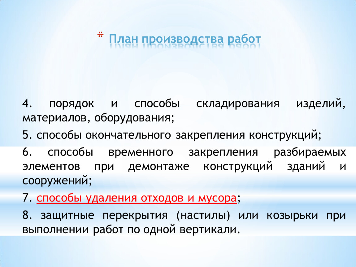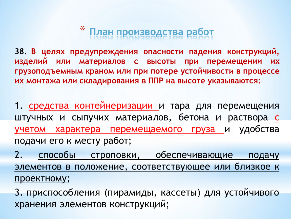 В целях предупреждения опасности падения конструкций, изделий или материалов с высоты при перемещении их грузоподъемным краном или при потере устойчивости в процессе их монтажа или складирования в ППР на высоте указываются: