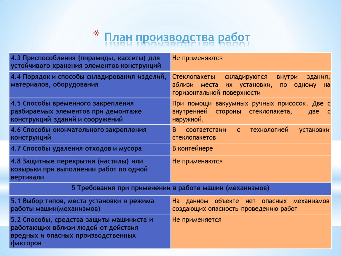 5.1 Выбор типов, места установки и режима работы машин(механизмов) | На данном объекте нет опасных механизмов создающих опасность проведению работ |