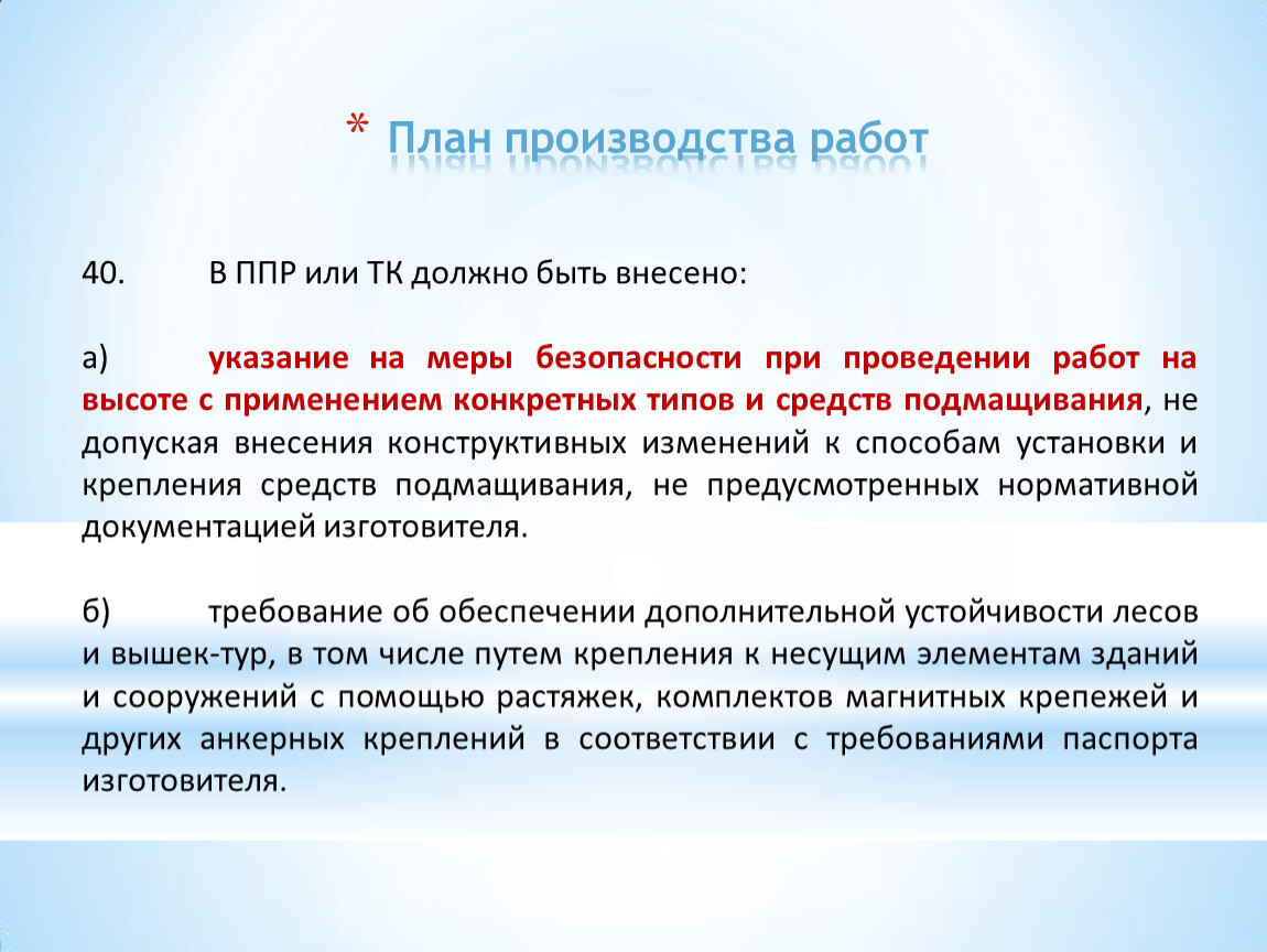 а) указание на меры безопасности при проведении работ на высоте с применением конкретных типов и средств подмащивания, не допуская внесения конструктивных изменений к способам установки и крепления средств подмащивания, не предусмотренных нормативной документацией изготовителя.