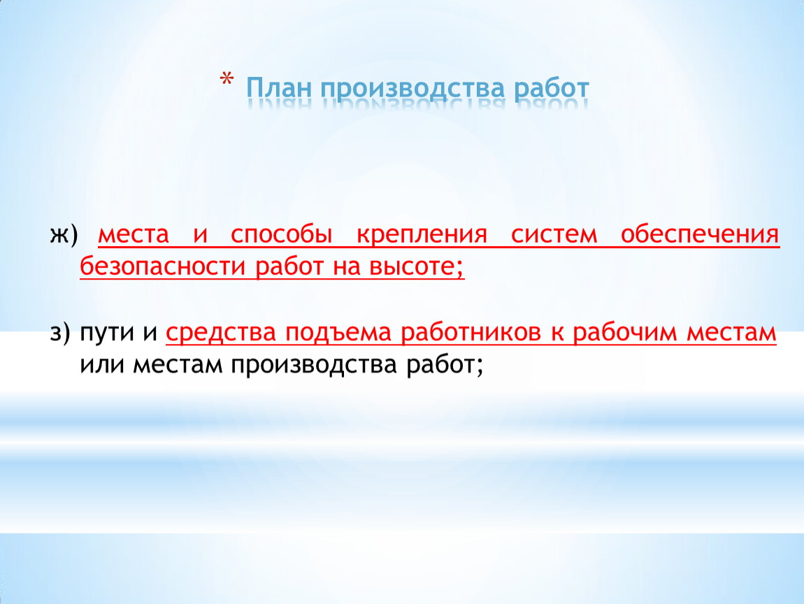 ж) места и способы крепления систем обеспечения безопасности работ на высоте;