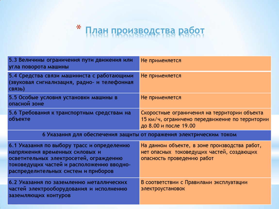 6.1 Указания по выбору трасс и определению напряжения временных силовых и | На данном объекте, в зоне производства работ, нет опасных токоведущих частей, создающих опасность проведению работ |