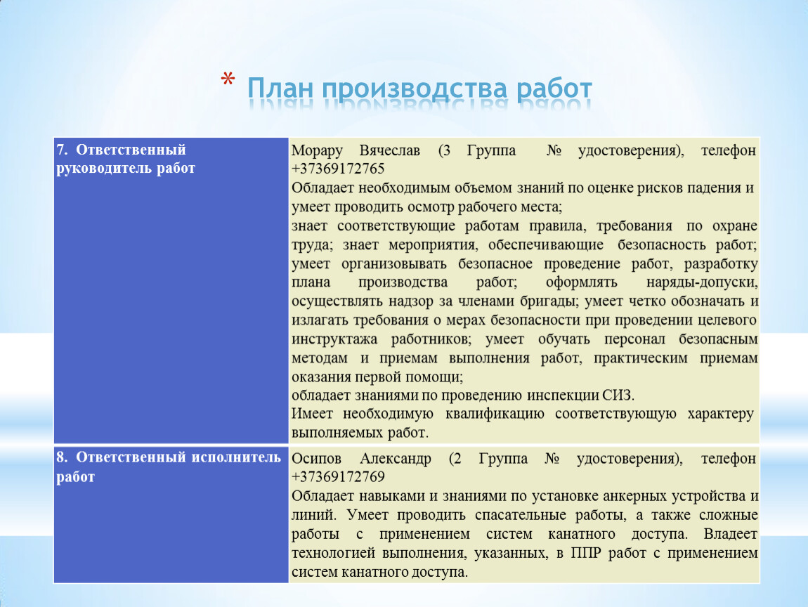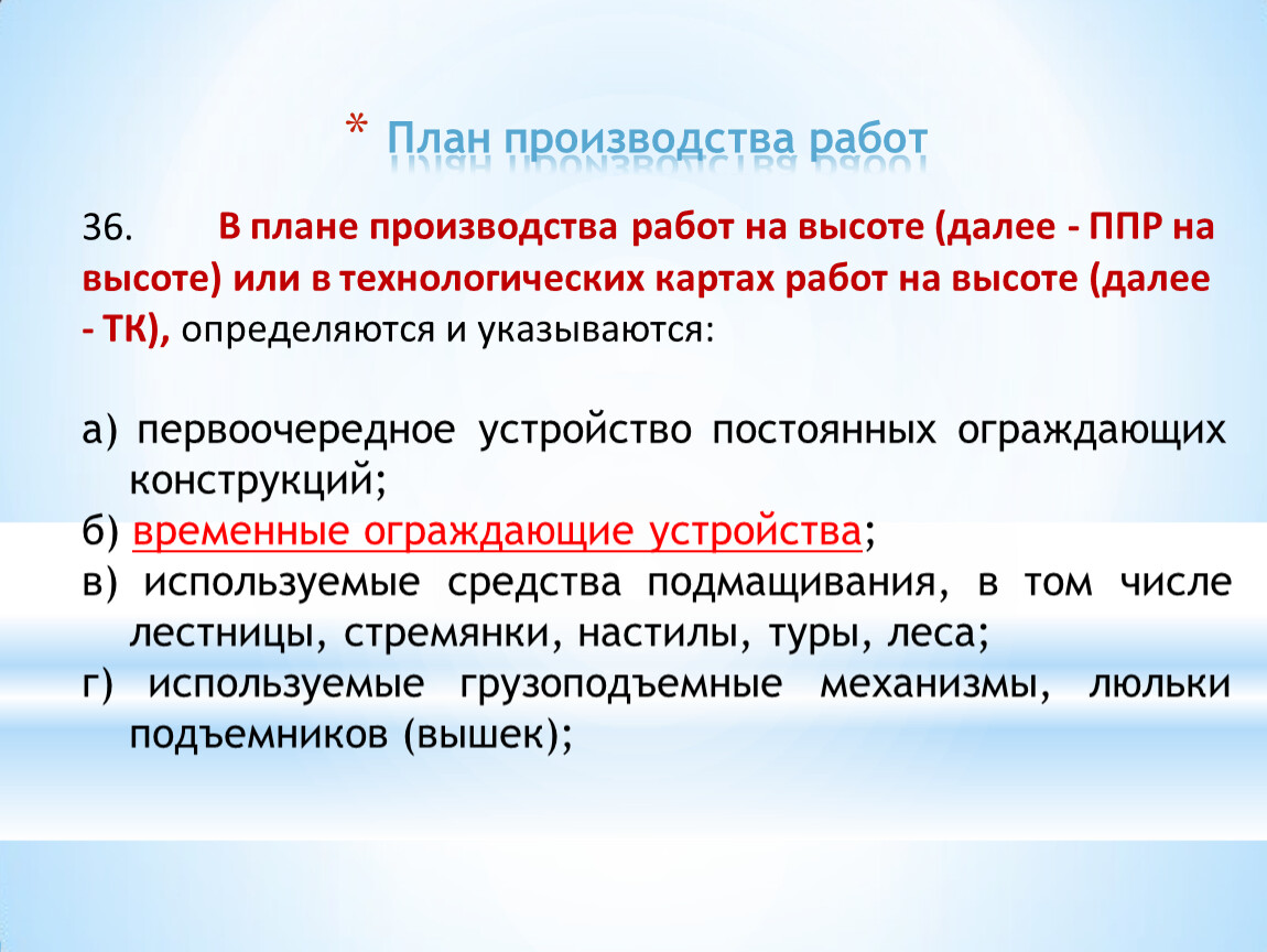 а) технико-технологические мероприятия, включающие в себя разработку и выполнение плана производства работ на высоте (далее - ПНР на высоте) или разработку и утверждение технологических карт на производство работ (содержание ППР и технологических карт на высоте