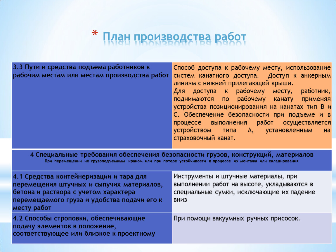 3.3 Пути и средства подъема работников к | Способ доступа к рабочему месту, использование систем канатного доступа. Доступ к анкерным линиям с нижней прилегающей крыши. |