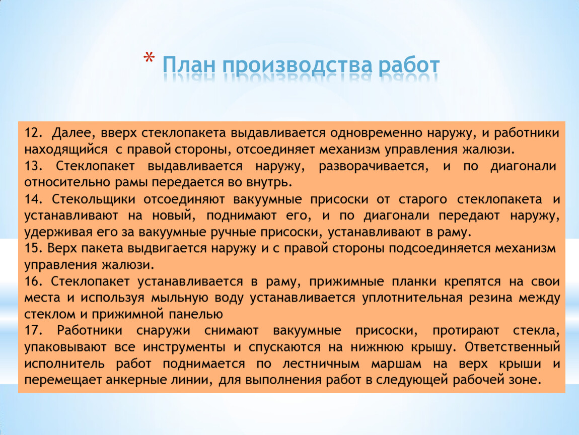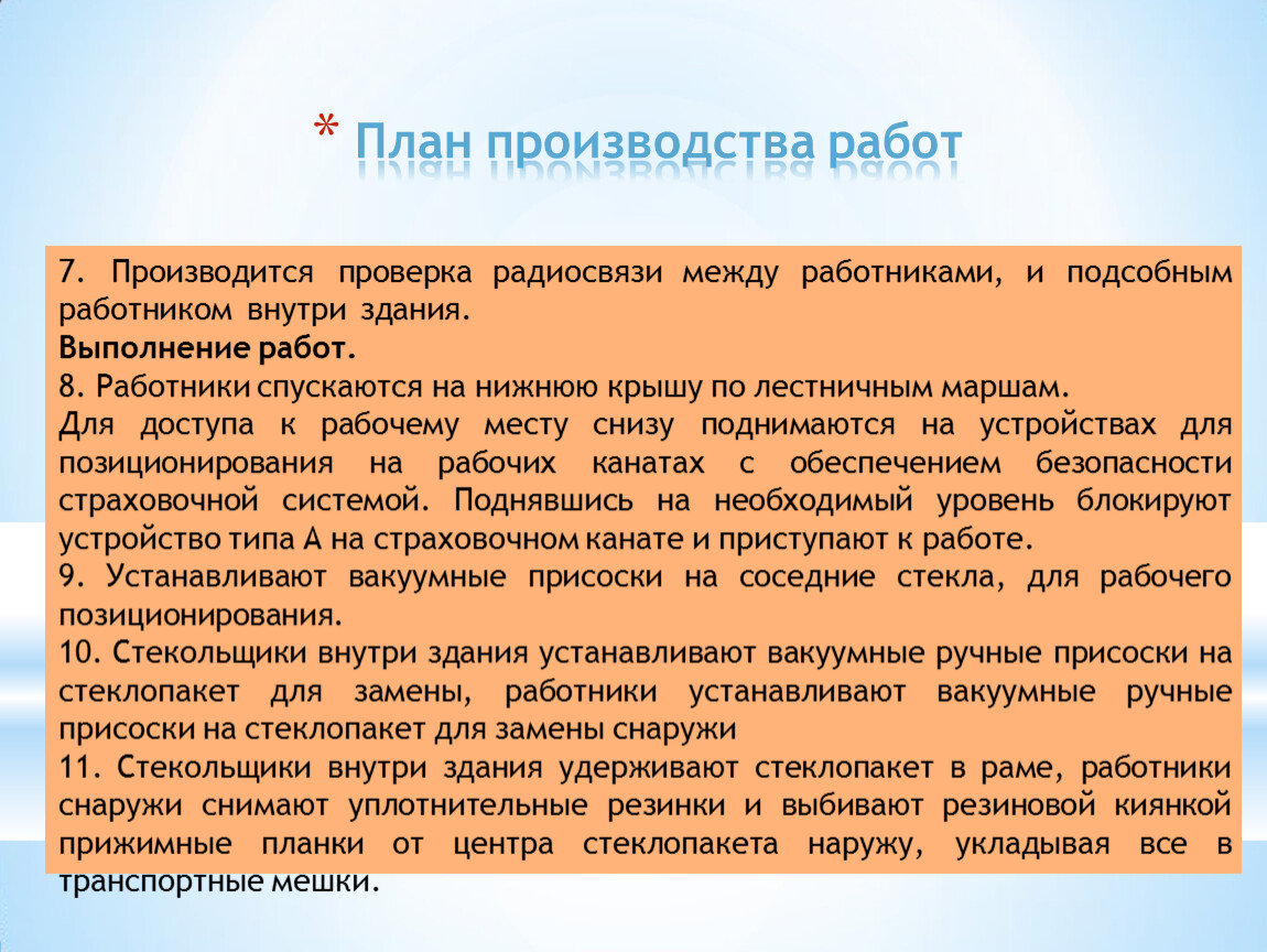 Работники снаружи снимают вакуумные присоски, протирают стекла, упаковывают все инструменты и спускаются на нижнюю крышу. Ответственный исполнитель работ поднимается по лестничным маршам на верх крыши и перемещает анкерные линии, для выполнения работ в следующей рабочей зоне.