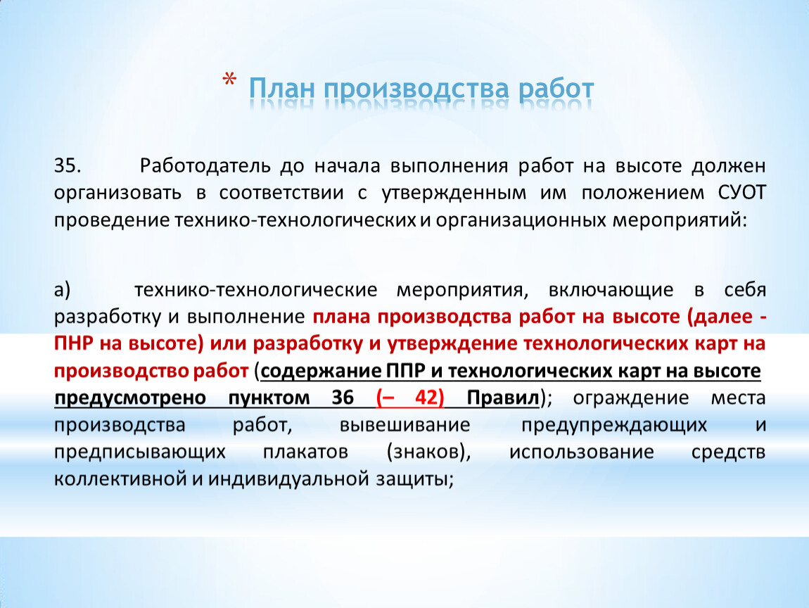 35. Работодатель до начала выполнения работ на высоте должен организовать в соответствии с утвержденным им положением СУОТ проведение технико-технологических и организационных мероприятий: