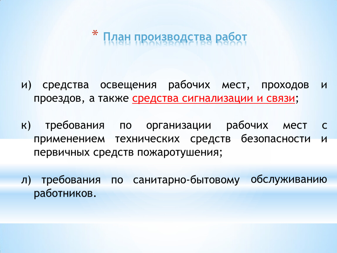 и) средства освещения рабочих мест, проходов и проездов, а также средства сигнализации и связи;